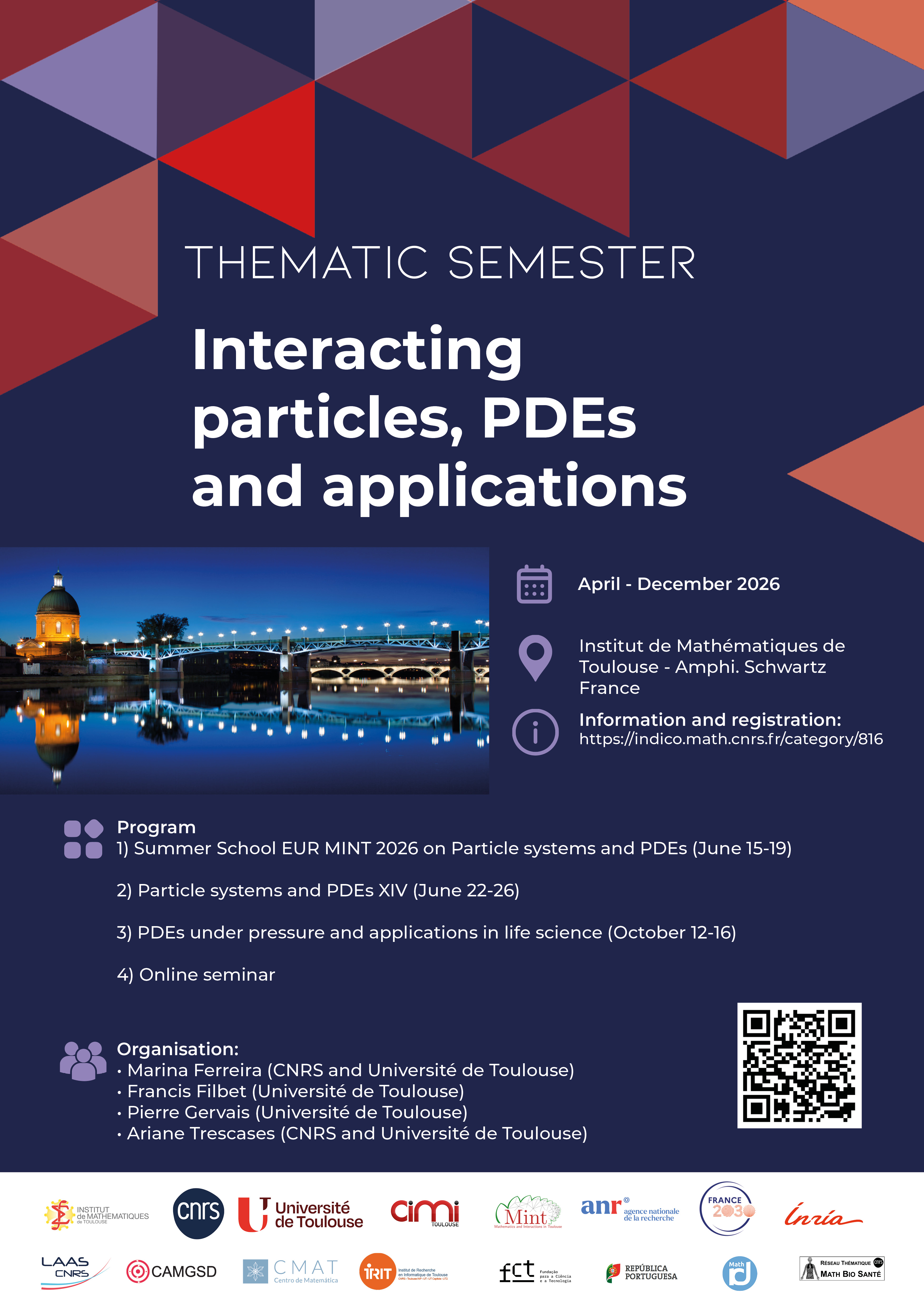 This semester has received the support of the International Center of Mathematics and Computer Science in Toulouse (CIMI), the MINT graduate school, CNRS, Université de Toulouse, Institut de Mathématiques de Toulouse, Institut Camille Jordan, Universidad de Lisboa, Universidad do Minho, the ANR grant MBAP-P, the PEPR grant PREMMOVE, the FCT grants UIDB/04459/2020 and UIDP/04459/2020 and UID/00013/2025 and the RT Math Bio Santé